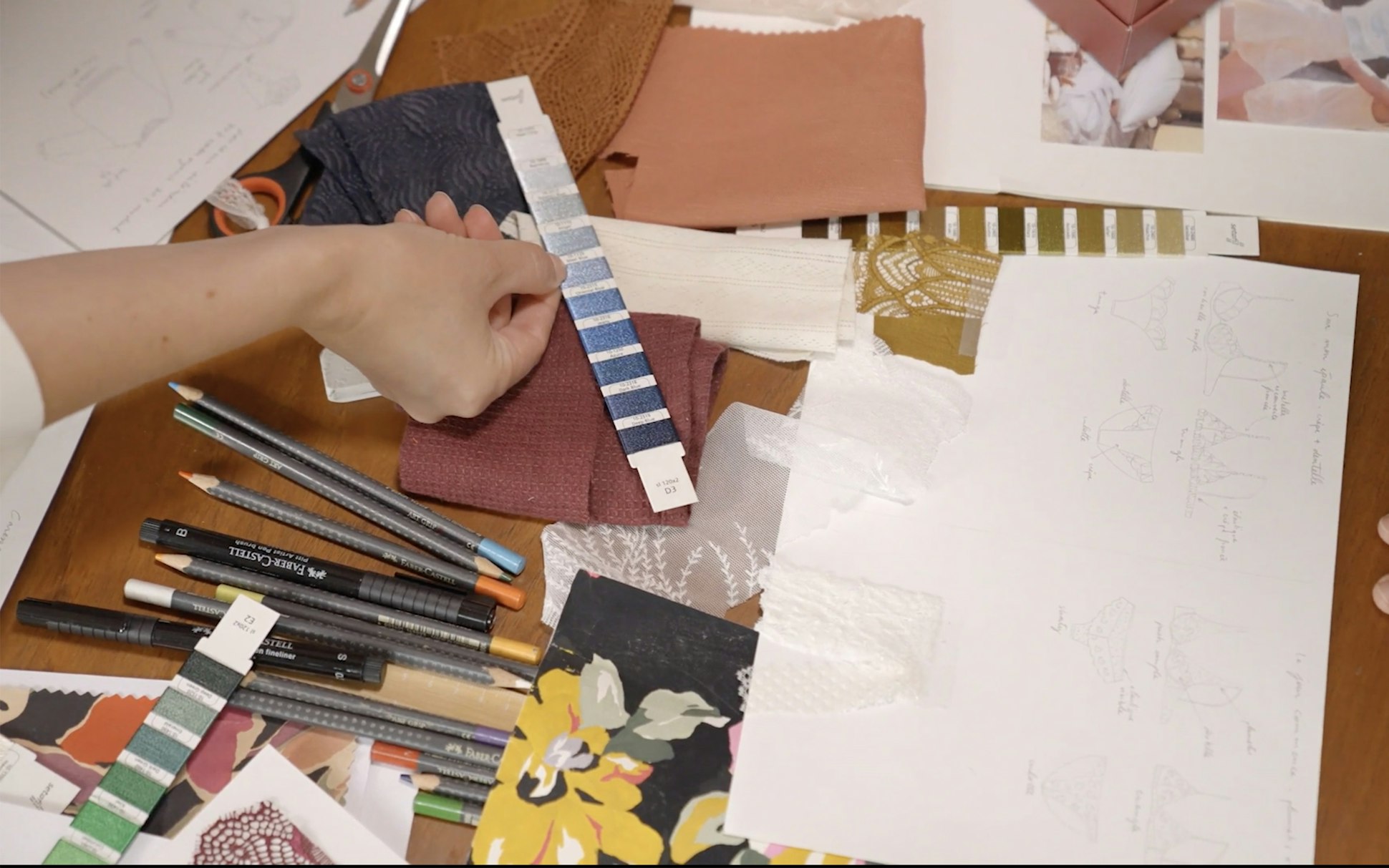 De premières idées prennent vie à travers des croquis et ébauches, puis les pièces commencent à se préciser avec le choix des matières et des coloris.